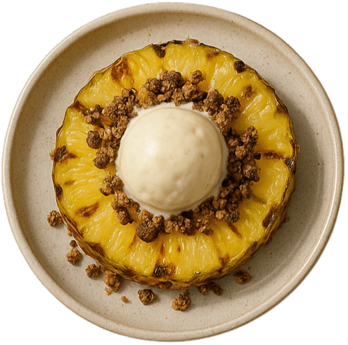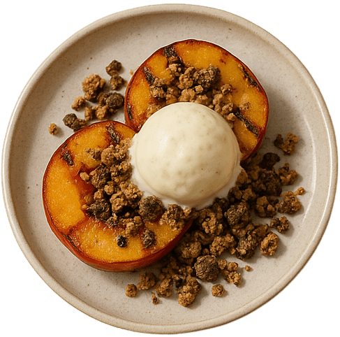 - Die Früchte vorsichtig vom Grill nehmen und mit dem Crumble und Vanilleeis toppen.