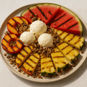 Ein besonderes Highlight: Früchte vom Grill mit selbstgemachtem Müsli. Dieses Dessert verbindet warmes, karamellisiertes Obst mit knusprigem Topping – eine perfekte Kombination, die sich einfach vorbereiten lässt. Das Rezept findest du am Ende des Beitrags!