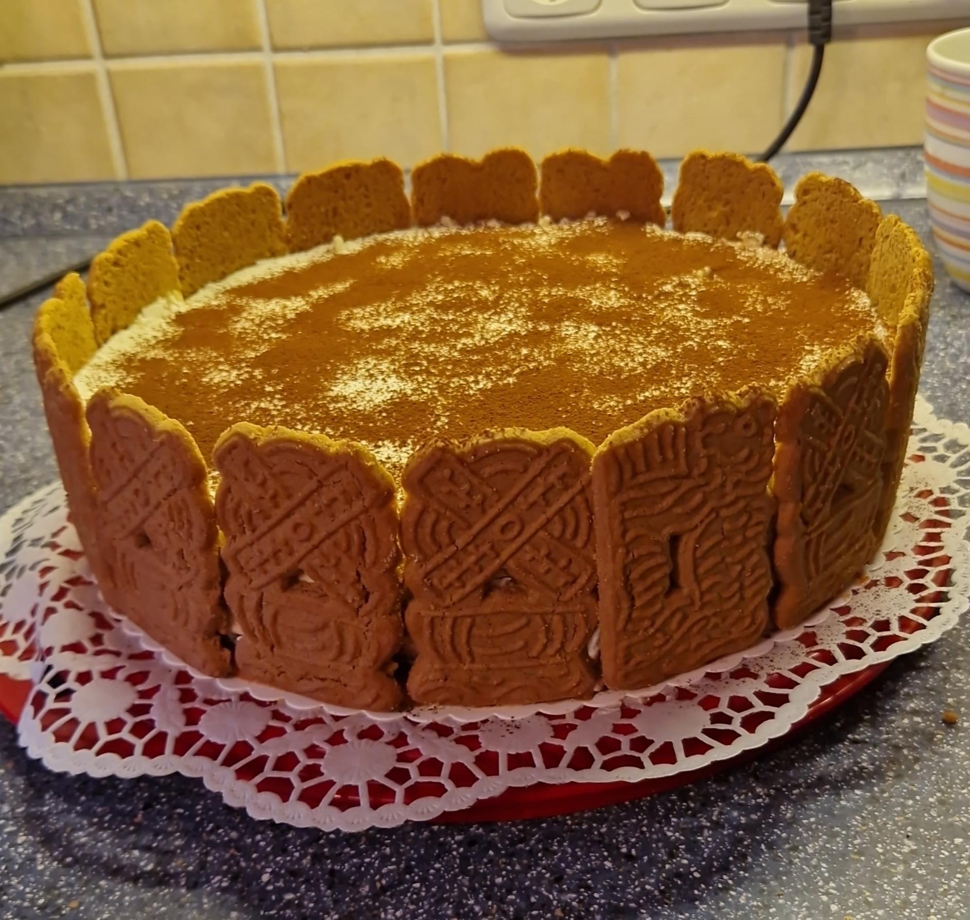 - Für die Verzierung bestäube die Torte dick mit Kakao und belege den Rand mit Spekulatiusfiguren.